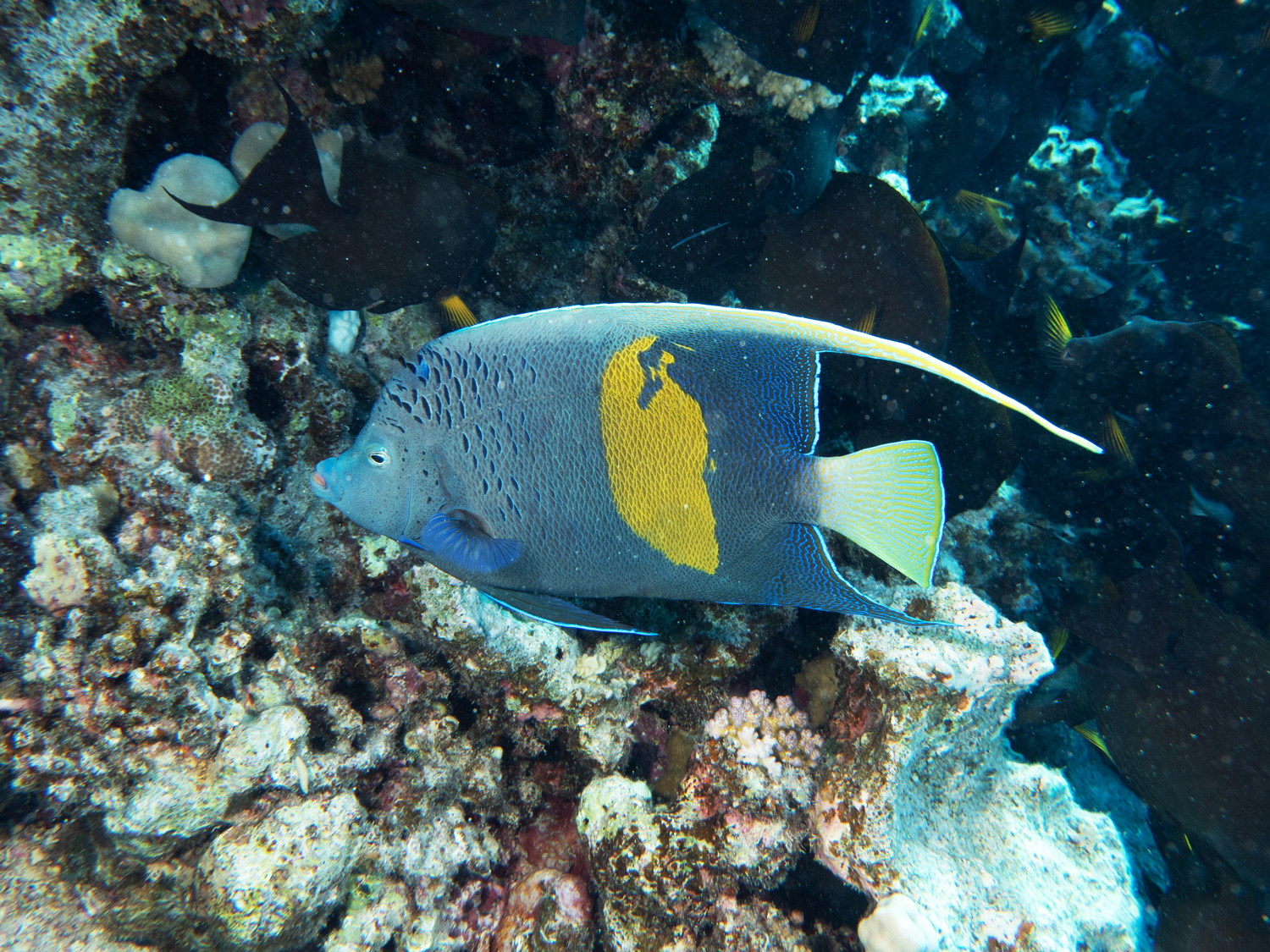 triggerfish, wrasse, parrotfish and doctorfish patrol the reef. Angelfish, flagfish and grubfish hang in schools and pose for photos with pinnacle canyons as a backdrop. Barracuda and horse mackerel are often seen, as are tuna and even whitetip sharks.